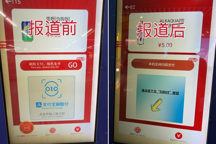 在地铁站,自动售货机的支付流程已发生了重大变化。报道时,部分自动售货机在支付环节着重突出“刷脸”支付功能,在告知、授权流程上存在欠缺。目前,自动售货机品牌的“刷脸”设备都处于关闭状态,操作界面上仅显示“点击下方‘扫码付’按钮”或“现金支付”的指引。