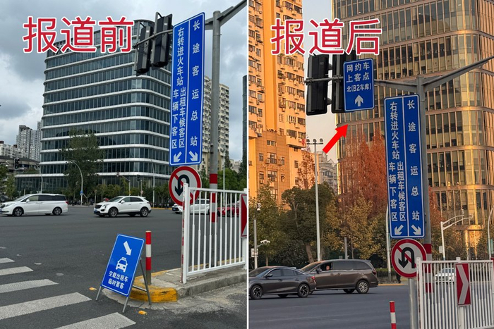 报道时,北广场周边路段针对网约车的标识存在不足,网约车司机容易在中兴路普善路路口、中兴路大统路路口或走错车道,或无法及时发现接客入口。12月29日,记者再次走访时看到,上述两个入口在多个方向增设了“网约车上车点北(B2车库)”及带方向箭头的指引牌,网约车司机可直观分辨网约车接客与出租车及送客的不同车道,以及前往大统路760号的接客入口。