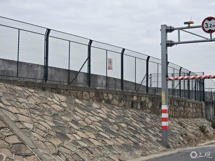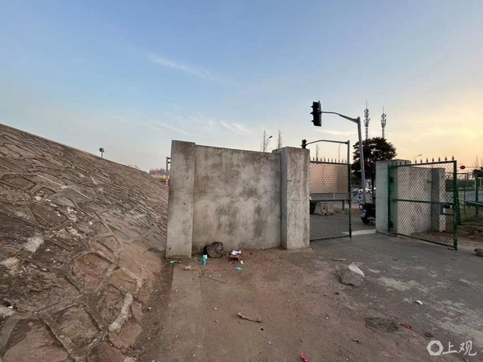 不仅是这里,整片防汛墙已经通通被两米高的围栏围住,再加上角度陡峭的斜坡,想从双江路一侧进入江边区域非常困难。(解放日报记者郑朕)
