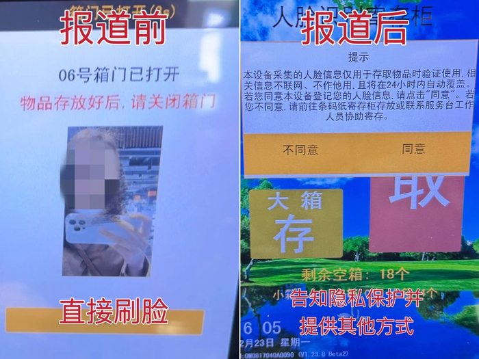 去年4月、7月,“民声直通车”记者连续聚焦公共场所过度采集人脸信息的现象,对游泳馆更衣柜安装“刷脸”设备,自动售货机诱导“刷脸支付”等案例予以曝光,推动了部分经营主体的整改。近期,记者再次回访查看其他场景的整改成效。