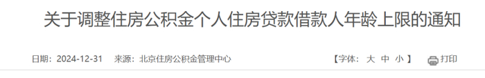 2024年12月31日,北京住房公积金管理中心发布了《关于调整住房公积金个人住房贷款借款人年龄上限的通知》。