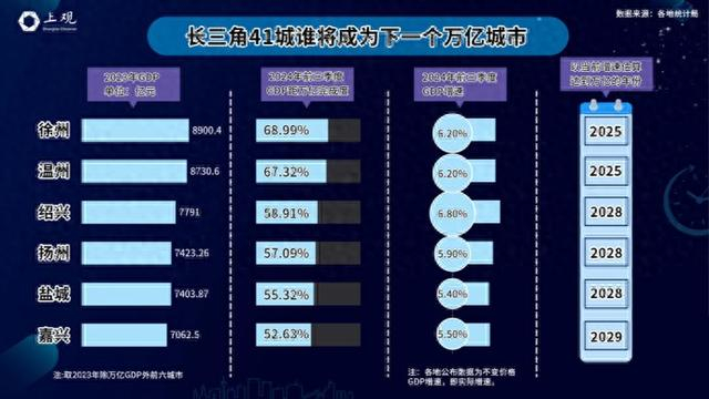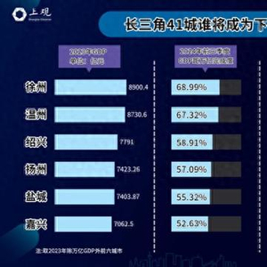 这一年长三角两座城市——江苏徐州、浙江温州——或将携手迈入万亿城市行列。上次长三角一年上新两座万亿城市还是在2020年,当年合肥、南通双双迈入“万亿俱乐部”。与此同时,长三角还有一批7000亿元级别城市,包括绍兴、扬州、盐城、嘉兴等,成为未来几年长三角万亿城市“后备军”。