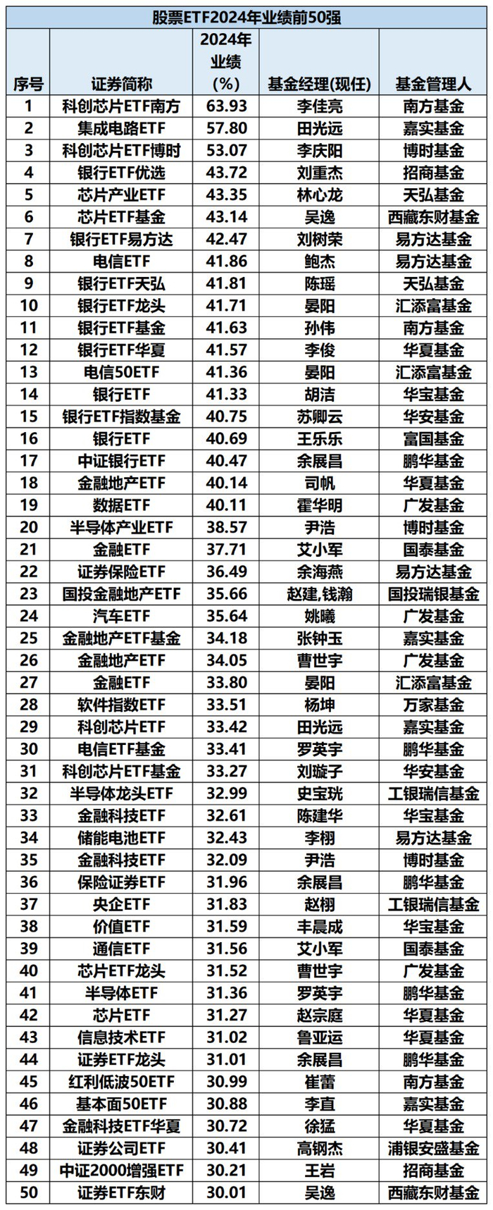从具体指数基金表现来看,2024年净值增长率前10只股票ETF中,和芯片、银行相关的产品“霸屏”。其中,南方科创芯片ETF2024年业绩高达63.93%,位居股票ETF业绩第一。紧随其后的是嘉实集成电路ETF、博时科创芯片ETF,2024年净值收益率分别为57.80%、53.07%。