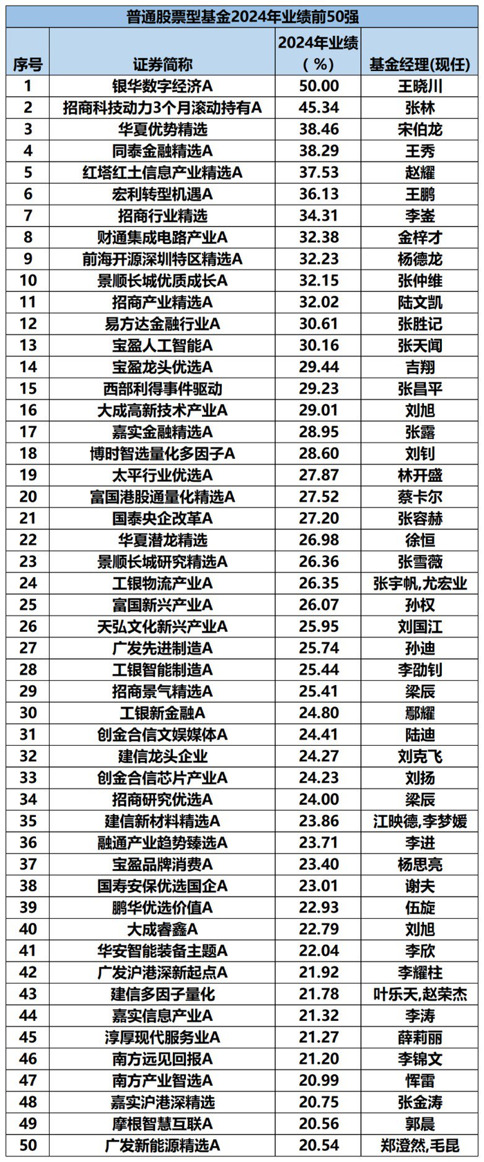 2024年净值增长率超过50%的,还有张宇帆和马丽娜管理的工银新兴制造A,以及王晓川管理的银华数字经济A,这两只基金2024年净值增长率分别为50.28%、50.00%,位列2024年主动权益基金业绩榜单的第三位、第四位。