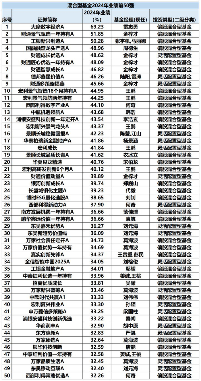 2024年,混合型基金平均斩获3.86%的单位净值涨幅,排名前50的混合型基金2024年业绩均超32%。其中,雷志勇管理的大摩数字经济A,2024年净值增长率达69.23%,位列混合型基金业绩第一。紧随其后的是金梓才管理的财通景气甄选一年持有A,张宇帆、马丽娜共同管理的工银新兴制造A,2024年业绩均超50%。