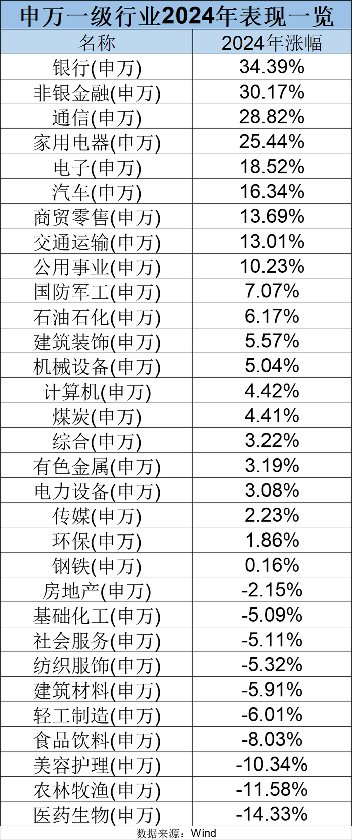 从板块表现来看,从申万一级行业来看,银行业成为2024年表现最好行业,涨幅达到34.39%,非银金融、通信、家用电器等涨幅也超25%。而医药生物、农林牧渔、美容护理等板块跌幅超过10%。