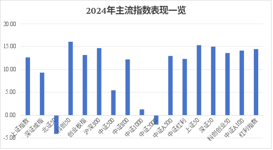 具体来看,主流指数这一波行情推动之下,2024年普遍上涨。数据显示,上证指数、深证成指、沪深300指数2024年分别涨12.67%、9.34%、14.68%,科创50指数表现较好,涨幅超过16%。