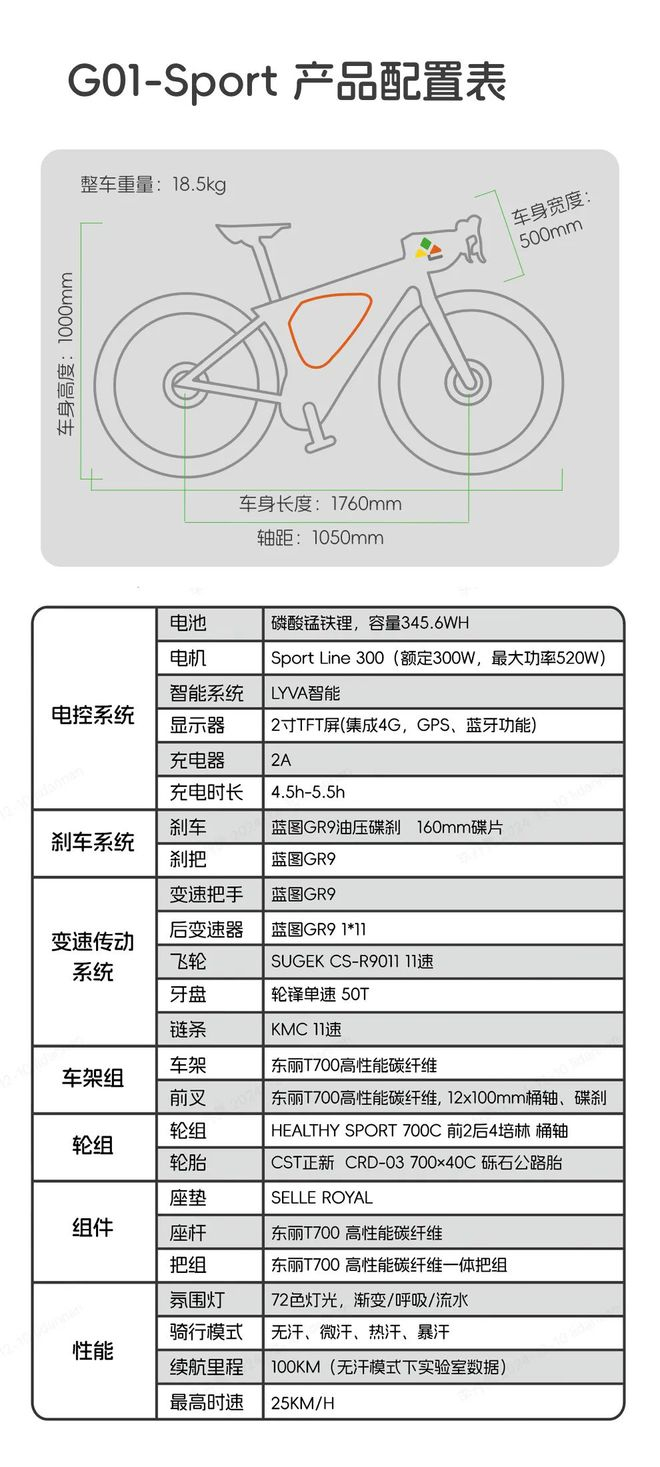具体配置方面,G01-Sport 搭载 Sport Line 300 中置电机、345Wh 磷酸锰铁锂电池,车把配有 2 英寸 TFT 显示屏,集成 4G、GPS、蓝牙功能,IT之家附配置表如下: