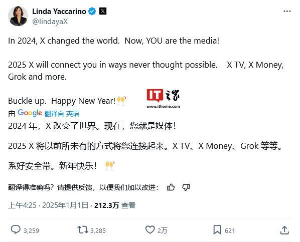 IT之家 1 月 1 日消息,X 首席执行官琳达・雅卡里诺(Linda Yaccar)在新年贺词中,宣布将于 2025 年上线 X Money 支付系统。该系统的推出,将进一步完善 X 平台的功能,并可能对社交媒体和支付领域带来深远影响。