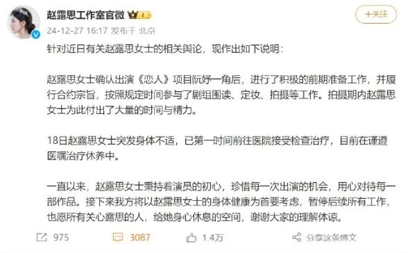 2024年12月27日下午,赵露思工作室发文回应赵露思身体情况:“赵露思女士确认出演《恋人》项目阮妤一角后,进行了积极的前期准备工作,并履行合约宗旨,按照规定时间参与了剧组围读、定妆、拍摄等工作。拍摄期内赵露思女士为此付出了大量的时间与精力。”