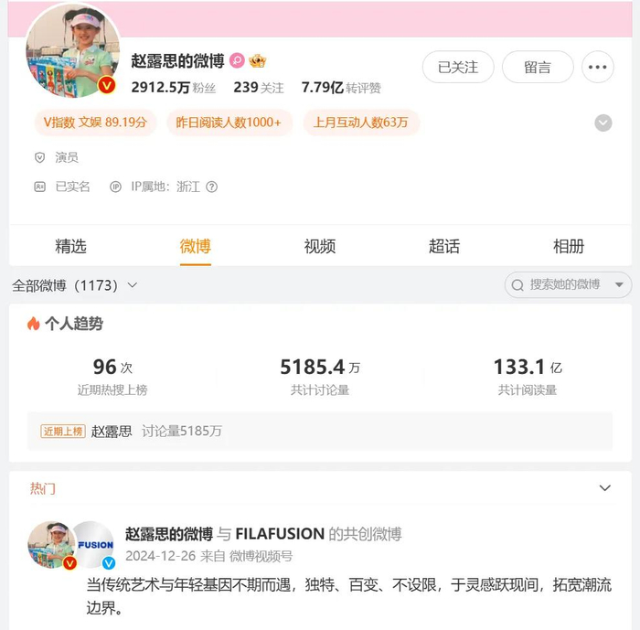 主页显示,赵露思最新一条微博更新于2024年12月26日。