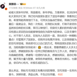 刚刚,奥运冠军、中国羽毛球队队员黄雅琼在个人官方微博宣布:已申请退出国家队。此前,黄雅琼的混双搭档郑思维已经宣布退出国际赛事。