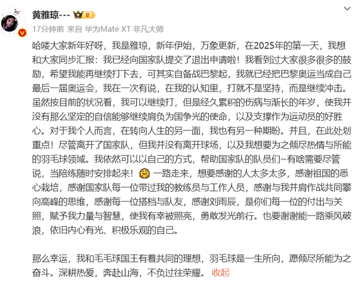 哈喽大家新年好呀,我是雅琼,新年伊始,万象更新,在2025年的第一天,我想和大家同步汇报:我已经向国家队提交了退出申请啦!我看到过大家很多很多的鼓励,希望我能再继续打下去,可其实自备战巴黎起,我就已经把巴黎奥运当成自己最后一届奥运会,我在一次有说,在我的认知里,打就不是坚持,而是继续冲击。虽然按目前的状况看,我可以继续打,但是经久累积的伤病与渐长的年岁,使我并没有那么坚定的自信能够继续肩负为国争光的使命,以及支撑作为运动员的好胜心。对于我个人而言,在转向人生的另一面,我也有另一种期盼。并且,在此处划重点!尽管离开了国家队,但我并没有离开球场,以及我想要为之倾尽热情与所能的羽毛球领域。我依然可以以自己的方式,帮助国家队的队员们~有啥需要尽管说,当陪练随时安排起来!🤗 一路走来,想要感谢的人太多太多,感谢祖国的悉心栽培,感谢国家队每一位带过我的教练员与工作人员,感谢与我并肩作战共同攀向高峰的思维,感谢每一位搭档与队友,感谢刘雨辰,是你们每一位的付出与关照,赋予我力量与智慧,使我有幸被照亮,勇敢发光前行。也要谢谢能一路乘风破浪,依旧内心有光、积极乐观的自己。