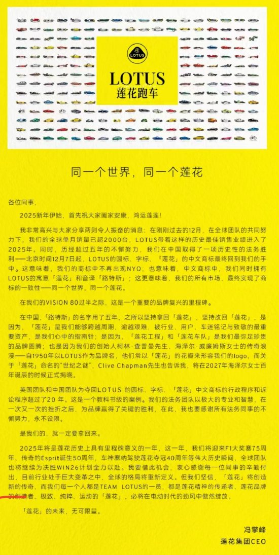 莲花跑车发布内部信称,全球单月销量已超2000台,LOTUS带着这样的历史最佳销售业绩进入了2025年。同时,历经超过五年的不懈努力,LOTUS的圆标、字标、‘莲花’的中文商标最终回到公司的手中。