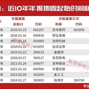 结合近10年的历史数据,2024年的年报披露起始日相对滞后,此前披露最早的是2016年年报,2017年1月14日由沪市公司北特科技正式揭开了当年年报“大戏”的帷幕;披露最晚的是2022年年报,2023年2月9日深市创业板公司金三江首当其冲,完成了当年年报的“开场秀”(见表1)。