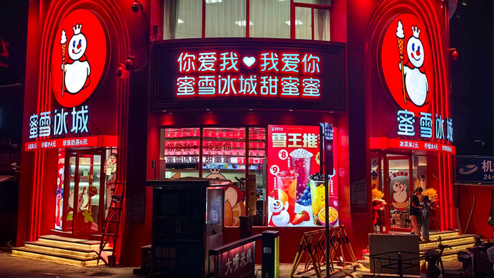 2018年,蜜雪冰城打造了“蜜雪冰城”的超级IP和终身代言人——雪王。现如今,“雪王”IP已经成为中国现制饮品行业中唯一一个超级IP,积累了来自全球不同国家、拥有不同文化背景的忠实粉丝。截至2024年12月27日,在主要社交平台上,“雪王”及“你爱我,我爱你,蜜雪冰城甜蜜蜜”主题曲的相关话题的累计曝光量分别超过87亿次及84亿次,动画《雪王驾到》播放量超过2.0亿次。“雪王”IP始于饮品、超越饮品,已然成为文化符号。