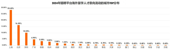 猎聘数据显示,海外留学人才的意向城市集中于北上广深,总占比59.8%,其中上海占28.4%,差不多相当于北京、深圳、广州之和。