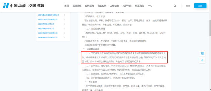 比如,中国华能下属多个分公司仍招收留学生,只是不再考虑一年制硕士研究生。其在2025年校园招聘要求中明确写上:“2024年入学的港澳地区、英国、澳洲、新加坡等国(境)外一年制硕士研究生,原则上不纳入2025年招聘范围。”或是“2024年入学的国(境)外一年制硕士研究生除外。”