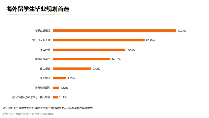 一份由中国世界青年峰会和猎聘发布调查报告显示,海外留学生毕业规划首选中,“考公务员”占了17.73%,排在第三。有74.4%的留学生认为海归群体中存在着“考公热”现象。