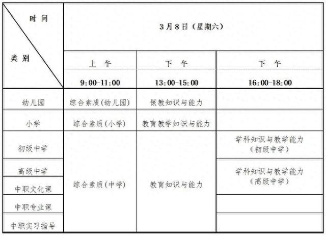中小学教师资格考试包括幼儿园、小学、初中、高中四个类别。申请认定中等职业学校文化课教师资格、中等职业学校专业课和中等职业学校实习指导教师资格者参加高中类别的考试。