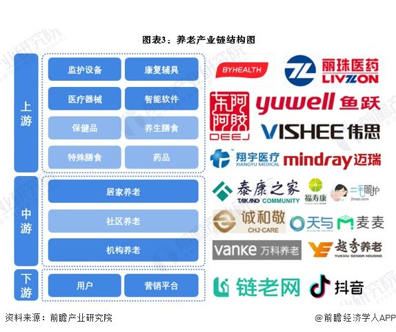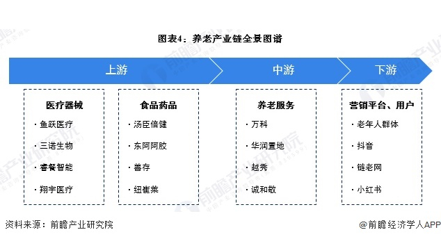 目前,我国养老产业上游的医疗器械代表企业有:鱼跃医疗、三诺生物、睿餐智能、翔宇医疗等;食品药品代表企业有:汤臣倍健、东阿阿胶、善存、纽崔莱等,中游的养老服务代表企业有:万科、华润置地、越秀、泰康之家、诚和敬、和亲源等,下游的营销代表平台有:链老网、抖音、小红书等。