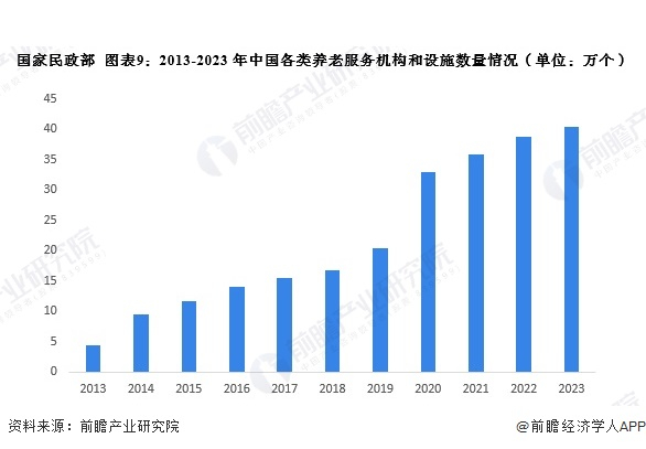 2013-2023年,我国各类养老服务机构和设施数量整体呈增长趋势。根据国家民政部统计的数据,2023年我国各类养老服务机构和设施数量达到40.4万个,比2022年增加1.7万个。
