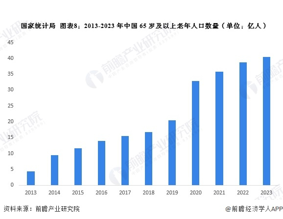 近年来,我国人口老龄化程度快速上升。2013-2023年,我国65岁及以上老年人口数不断增长,占总人口比重不断增加。据国家统计局发布的数据显示,截至2023年底,我国65岁及以上人口为2.17亿人,占总人口比重为15.4%,比重上升0.5个百分点,人口老龄化程度持续加深。
