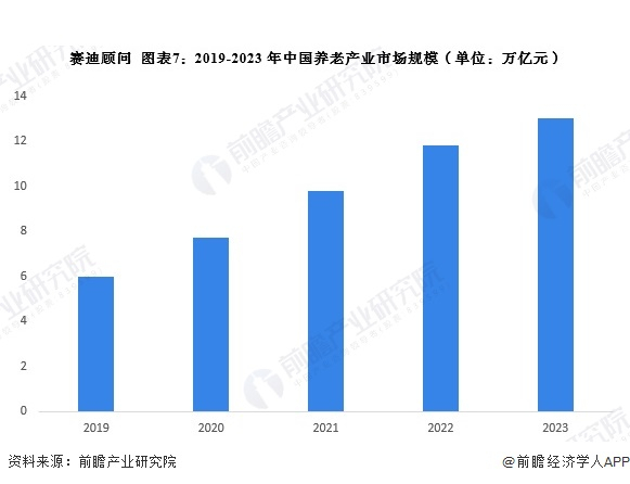 近年来,不断增长的老龄人口带来了养老产业的刚需。国家也越来越重视养老产业的发展,发布了一系列政策,包括支持社区养老模式革新、医养结合深化、智慧养老推进和养老金融市场开放等多个方向改革与开发,推动了养老产业全方位供给体系的形成。供给侧与需求侧双向作用下,我国养老产业规模逐渐扩大。初步统计,2023年养老产业市场规模达到13万亿元。