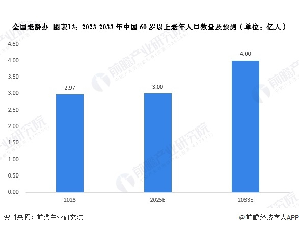 国家统计局数据显示,至2023年末,中国60岁及以上人口达到2.97亿,占全国总人口的比例为21.1.8%;65岁及以上人口2.17亿,占全国总人口的比例为15.4%。 据全国老龄办预测,预计到2025年,中国60岁及以上老年人口数将达到3亿,占总人口的五分之一;到2033年,中国老年人口将突破4亿,占总人口的1/4。
