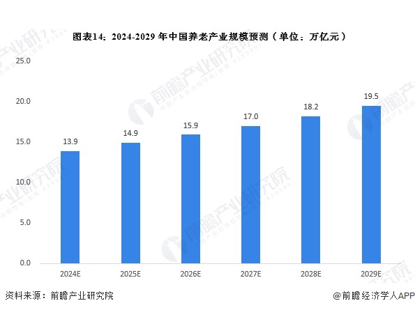 结合2019-2023年中国养老产业市场规模增速和我国老年人口增长情况,前瞻预计到2029年中国养老产业市场规模有望达到19.5万亿元,2024-2029年CAGR为7%左右。