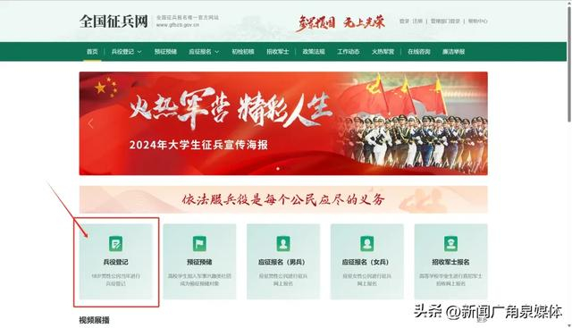 在全国征兵网(https://www.gfbzb.gov.cn/)首页,点击“ 兵役登记 ”;