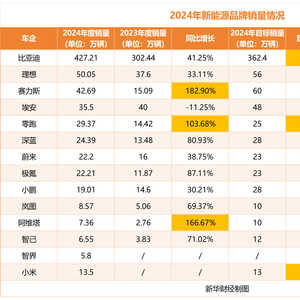 2024年新能源汽车销量出炉!赛力斯同比增长近200%,多家车企明年目标再翻番