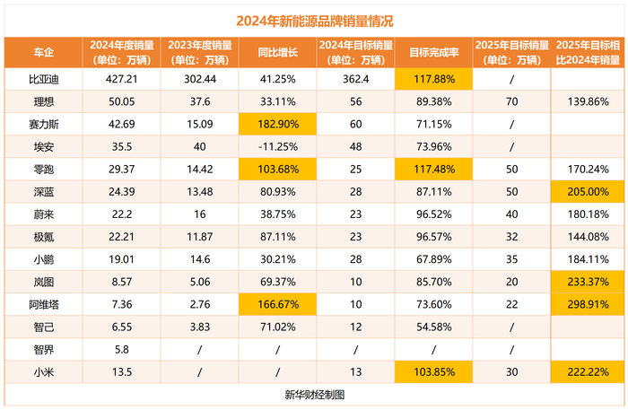 据新华财经统计,赛力斯、阿维塔、零跑汽车实现2024年销量同比翻番,其中赛力斯同比增长近200%,比亚迪、小米、零跑汽车等超额完成2024年度销量目标。