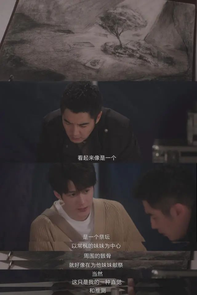 还有“魂锁峰都山”案件中,常枫是住在山里的导游,这里常有驴友来爬野山。一次,常枫为了救驴友害死了自己的妹妹,然而驴友对此却无动于衷,他开启审判模式:通过设置机关,让善良的人得以存活、让自私自利的人自己走向死亡。案情听上去还挺带感的,尤其是沈翊发现这些年所有的死者都是围绕着常枫的妹妹形成了一个祭坛,颇有些不明觉厉的感觉。但再想想,明明知道自己的妹妹身埋何处却不想着令其入土为安,妹妹手里握着的海棠果甚至还靠着养分长成了一棵海棠树,这个思路.......所以就像有观众评价的,这个剧能看,但不能细想。