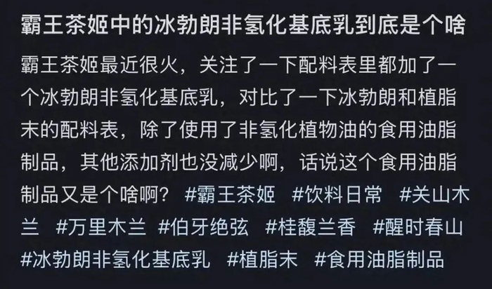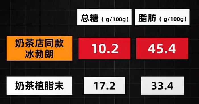 有网友指出,明明是含油、糖、香精、色素、乳化剂、增稠剂等成分的食品添加剂,糖和脂肪的含量甚至比植脂末还要高。却对消费者宣称是:健康鲜奶茶,是不是有点不厚道了?