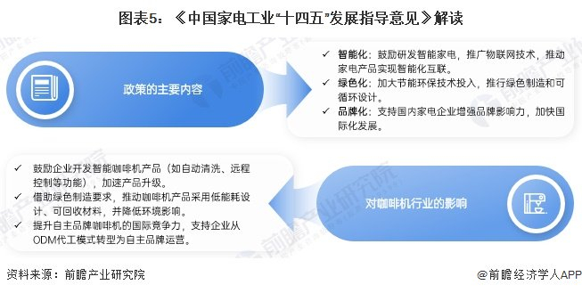 《中国家电工业“十四五”发展指导意见》旨在推动家电产业向智能化、绿色化、高端化转型,提高自主创新能力,增强国际竞争力。具体内容包括鼓励研发智能家电,推广物联网技术,推动家电产品实现智能化互联;加大节能环保技术投入,推行绿色制造和可循环设计;支持国内家电企业增强品牌影响力,加快国际化发展。对咖啡机行业的影响主要体现在开发智能产品、绿色设计、提升品牌竞争力、支持从ODM转型至自主品牌等方面。