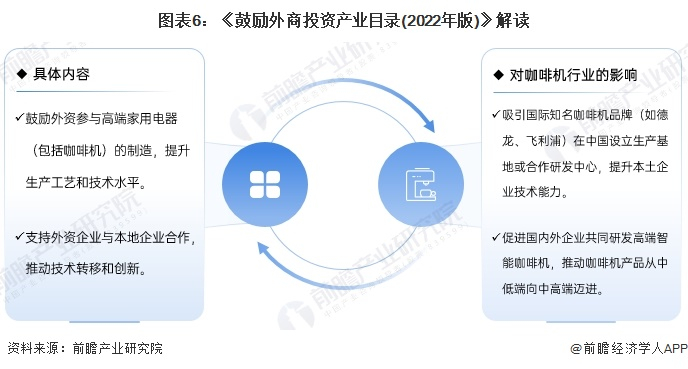 《鼓励外商投资产业目录(2022年版)》旨在吸引外资进入先进制造业和高端家电领域,促进产业链供应链升级。具体内容包括鼓励外资参与高端家用电器(包括咖啡机)的制造,提升生产工艺和技术水平,以及支持外资企业与本地企业合作,推动技术转移和创新。对咖啡机行业的影响主要体现在:吸引国际品牌在华设厂和研究中心,提升本土技术,并通过中外合作推动产品高端化。