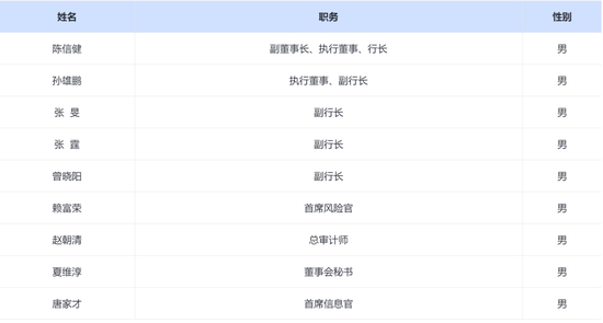 官网显示,目前兴银银行管理团队成员有,行长陈信健,副行长孙雄鹏、张旻、张霆、曾晓阳,首席风险官赖富荣,总审计师赵朝清,董事会秘书夏维淳,首席信息官唐家才。