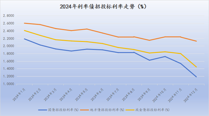 从利率曲线走势来看,地方债发行利率整体波动较小,政金债和国债季末大幅下行。数据统计显示,2024年12月国债、地方债和政金债的发行利率均破最低点,分别为1.1829%、2.1273%和1.4455%。
