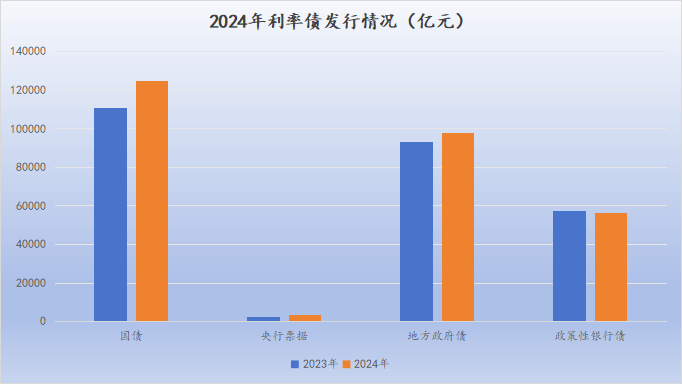 从发行规模来看,据新华财经梳理,2024年利率债发行规模环比增长7%。具体来看,国债发行124,761.3亿元,央行票据发行3,318.4亿元,地方债发行97,760.88亿元,政策性银行债发行56,489.2亿元。对比来看,国债、央行票据和地方债发行规模均较去年有所提升,环比分别增长12.39%、50.84%、4.83%,政策性银行债环比下降1.57%。