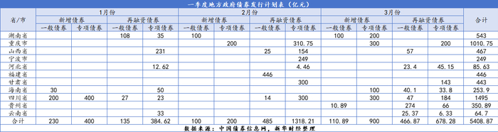 据新华财经梳理,截至2024年12月31日,湖南、重庆、山西、宁波、河北、福建、甘肃、海南等地均公布地方政府债券一季度发行计划,计划发行规模达5,408.87亿元。