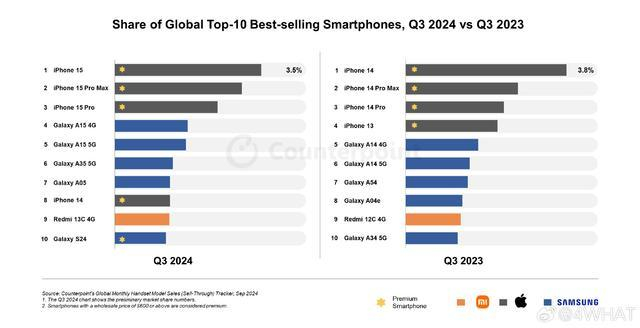 此前,市场调研机构Counterpoint最新公布2024年第三季度全球最畅销的前10款智能手机,毫不意外的销量冠军依然是来自苹果的iPhone。
