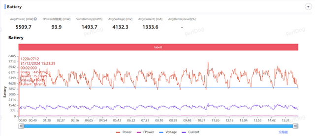 游戏期间整机的平均功耗为5.5W,同比上代低了约0.3W左右,用更低的功耗换来更稳定的帧率,可以看出REDMI Turbo 4在Soc性能调优方面下了不少功夫。