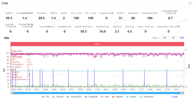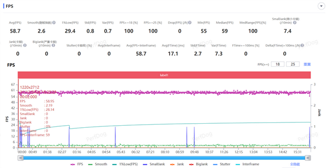 接着我们测试了原神手游,最高画质+最高帧率下特效全开,进行一局15分钟的须弥成跑图测试,游戏平均帧率59.3FPS,游戏期间略微有些波动,但整体的流畅度在主打性能的手机中隶属第一梯队。
