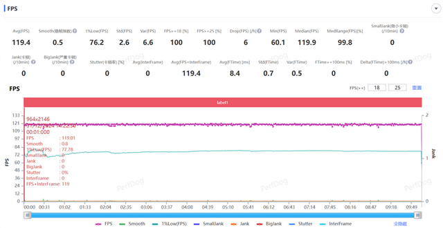 王者荣耀手游在极致画质+极高帧率模式下,一局5V5的激烈团战结束后,平均帧率依然稳定在119.4FPS,几乎没有任何波动,画面表现异常流畅与稳定。