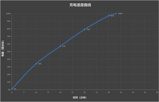 手机电量从1%开始进行灭屏充电,10分钟电量充至34%,20分钟电量过半,来到了57%,半小时充电至79%,最终完全充满用时43分钟。