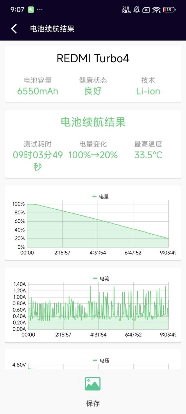 经过电池狗狗不间断测试,REDMI Turbo 4的电量从100%消耗至20%,用时9小时3分49秒,经过折算,满电续航可以达到接近112个小时,这样的续航成绩可以满足普通用户一天的使用时长。