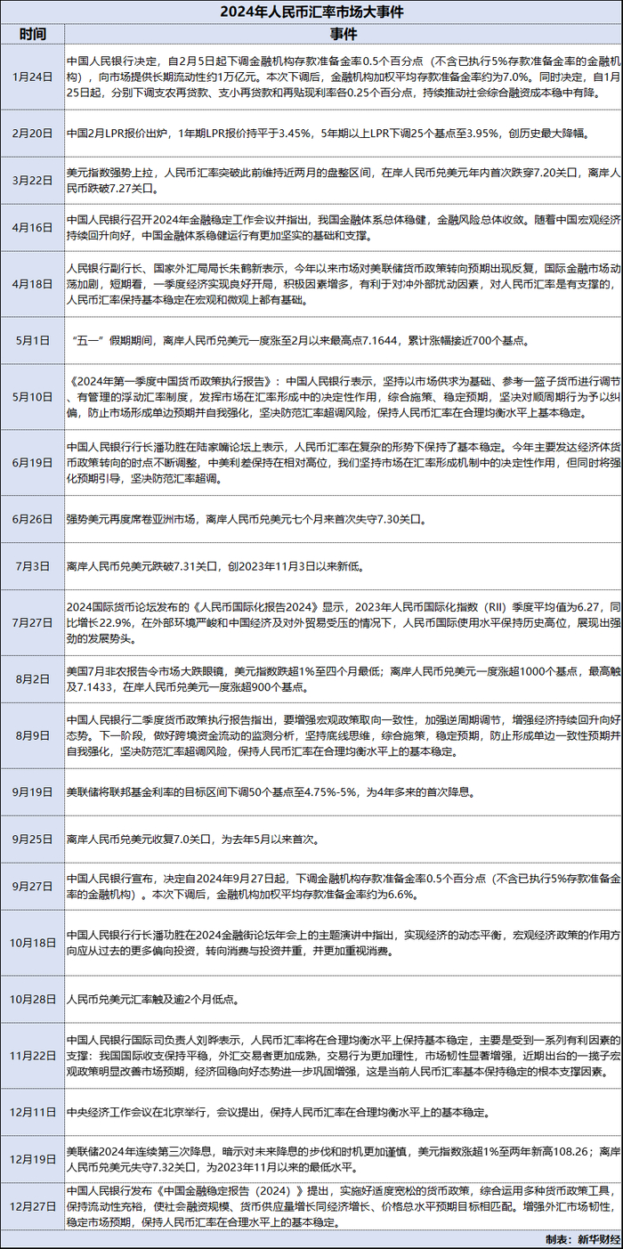 据统计,2024年,美元指数创两年新高,全年涨7%报108.48,为九年最佳年度表现。人民币兑美元整体在7.0-7.3区间波动,在岸人民币兑美元累计跌2068个基点报7.2988,离岸人民币兑美元累计跌2121个基点报7.3379,跌幅均约为3%;人民币对美元中间价累计调贬1057个基点报7.1884,跌幅约为1.5%。