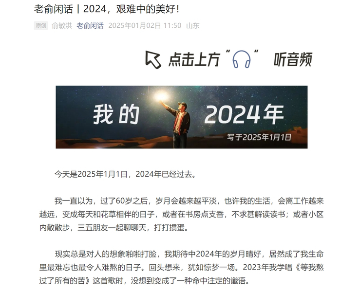 2025年1月2日,俞敏洪在公众号“老俞闲话”中发文总结2024年。