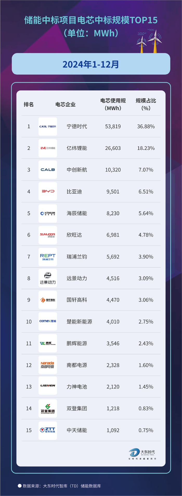 超145.9GWh!2024年储能电芯中标TOP15出炉!
